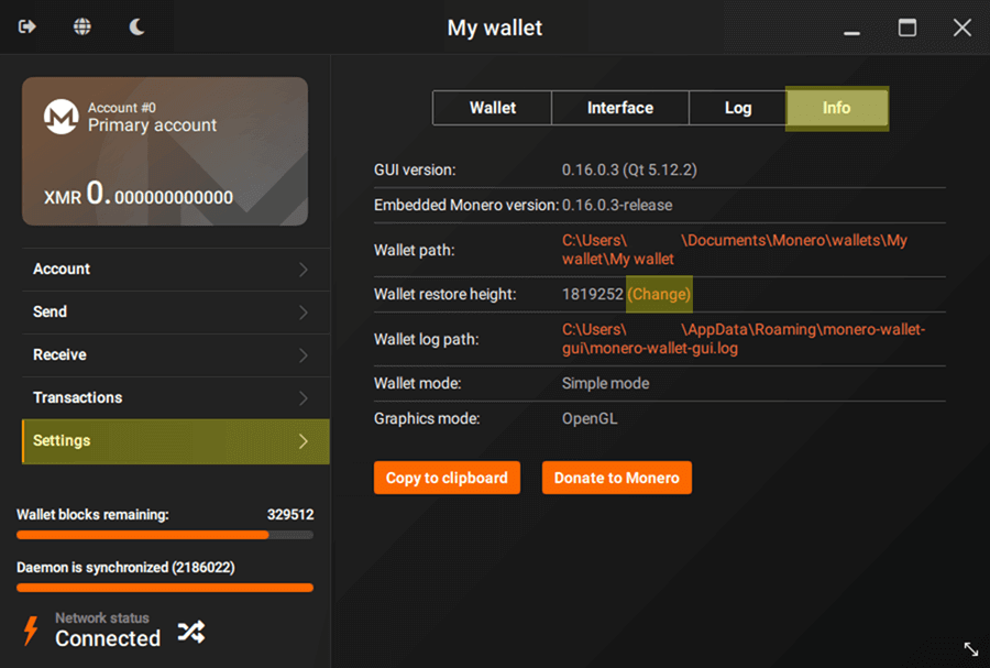 1) Go to Settings > Info page. On Wallet restore height:, click on (Change).